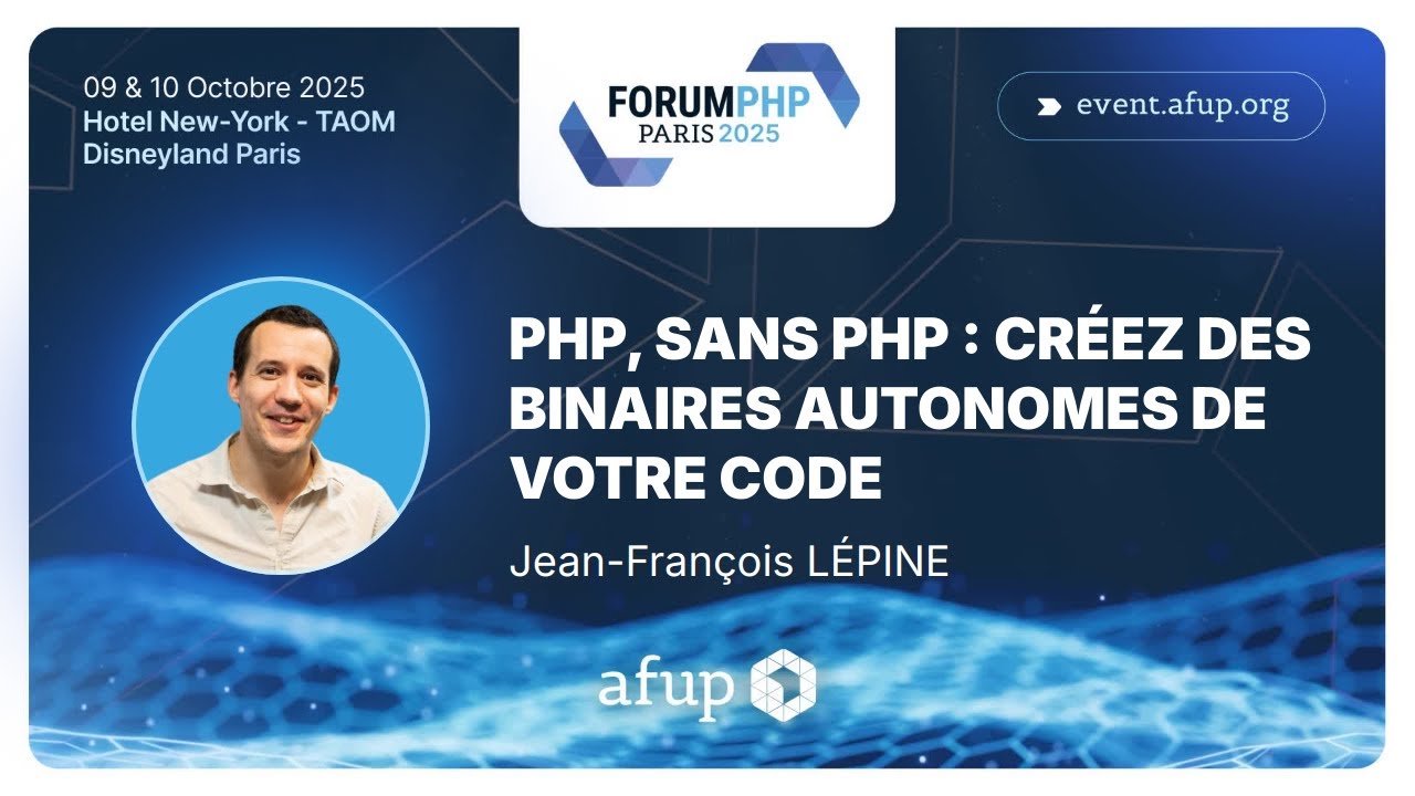 Plus d'informations sur cette conférence : https://afup.org/talks/5257-php-sans-php-creez-des-binaires-autonomes-de-votre-codeCette vidéo vous a plu ? Adhére...
