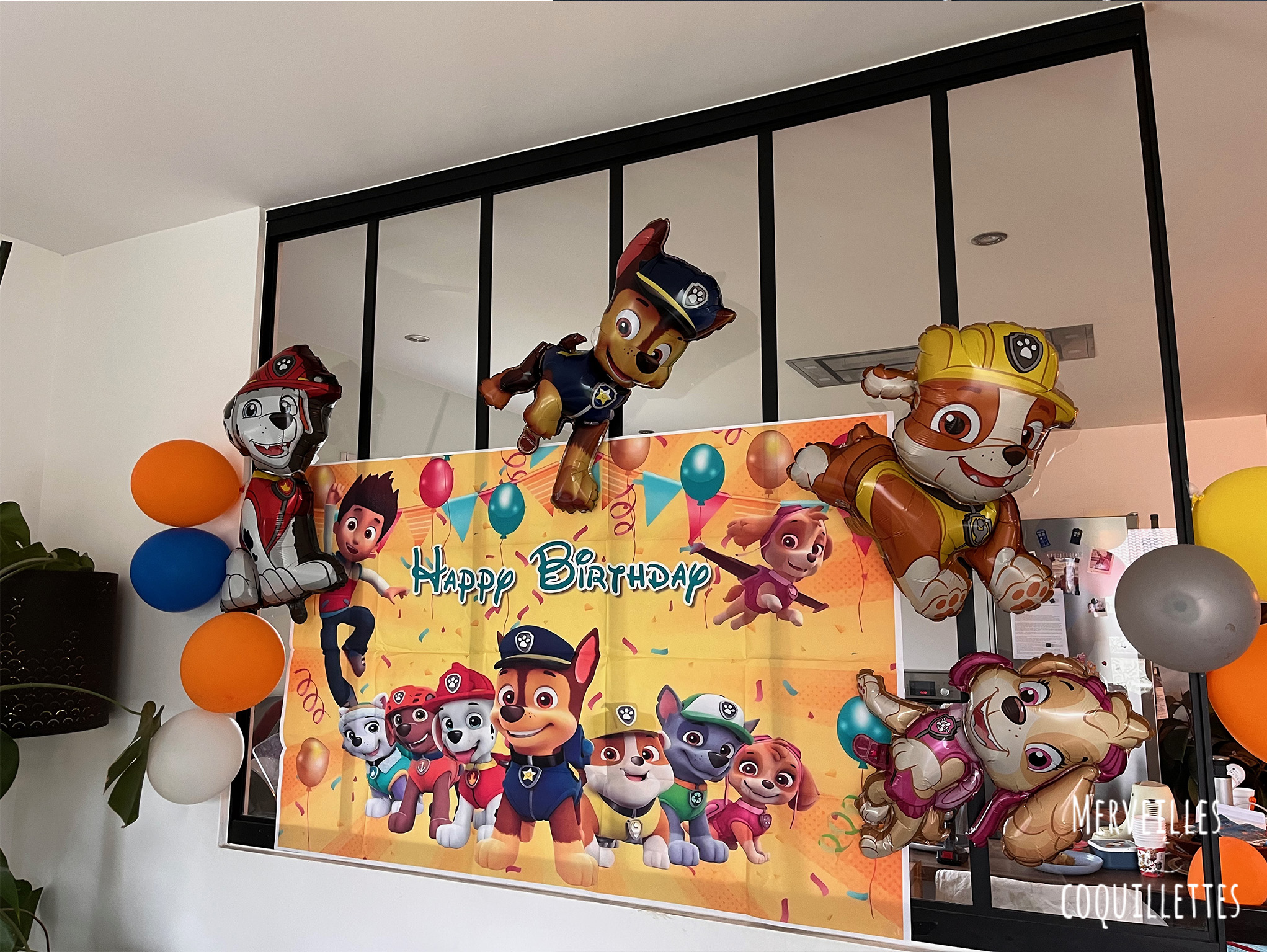 Côté déco, j’ai craqué sur une toile de fond et des ballons Pat Patrouille sur Aliexpress (J’avoue, ce n’est pas bien mais il était tellement heureux !) ! J’ai aussi un jour de pluie dessiné avec les enfants un Ruben avec mon projecteur que j’ai ensuite découpé !