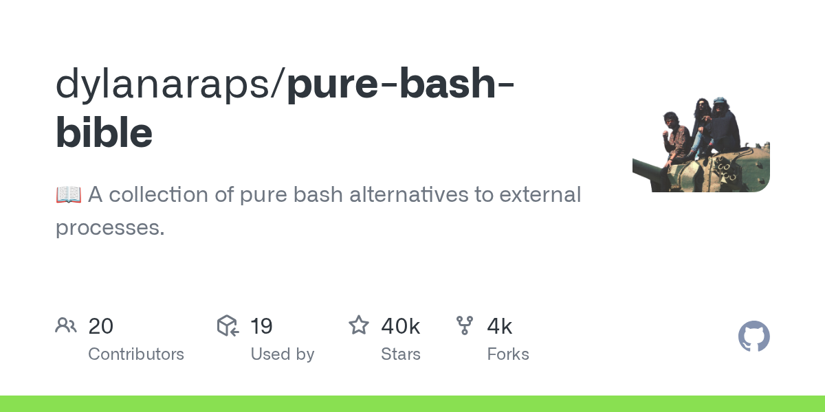 The goal of this book is to document commonly-known and lesser-known methods of doing various tasks using only built-in bash features. Using the snippets from this bible can help remove unneeded dependencies from scripts and in most cases make them faster. I came across these tips and discovered a few while developing neofetch, pxltrm and other smaller projects.